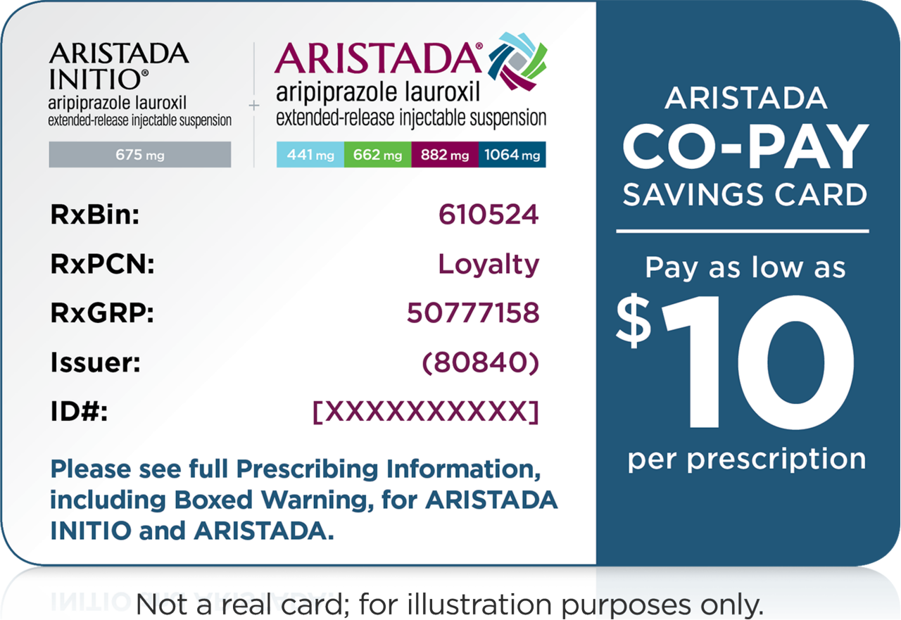 The ARISTADA INITIO and ARISTADA Co-pay Savings Program (“Program”) is only available to commercially insured patients who are 18 years or older with a valid ARISTADA INITIO and/or ARISTADA prescription(s). This Program is not available to patients who are enrolled in Medicare, Medicaid, or other federal or state healthcare programs. Eligible patients may pay as little as $10 per fill, after co-pay savings is applied. Maximum savings per fill is $800 for ARISTADA 441 mg, 662 mg, and 882 mg up to 12 fills per calendar year and $1600 for ARISTADA 1064 mg up to 6 fills per calendar year. Maximum savings for ARISTADA is $7600 per calendar year. Maximum savings for ARISTADA INITIO is $2000 total and limited to 4 fills per calendar year. Please see full Program Terms and Conditions at www.aristada.com/copay-savings. For questions about your eligibility or benefits, if your insurance has changed, or if you wish to discontinue your participation, call the ARISTADA INITIO and ARISTADA Co-pay Savings Program at 1-800-657-7613 (8:00 AM-8:00 PM ET, Monday-Friday).
