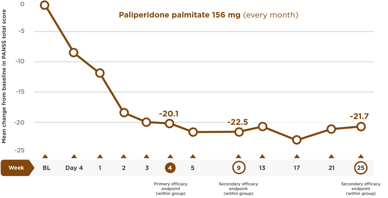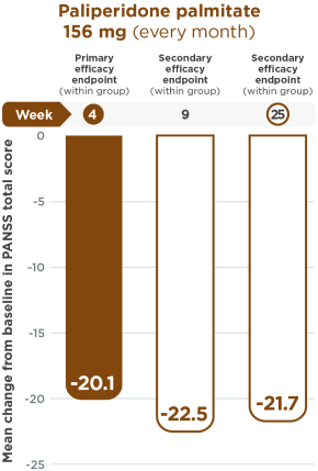 Reduction in PANSS total score from baseline was observed for the treatment group receiving paliperidone palmitate 156 mg every month1