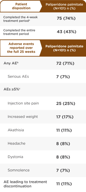 • Patients had to have a history of tolerated use of aripiprazole or risperidone/paliperidone, or demonstrated tolerability to prospective oral test doses during study screening1